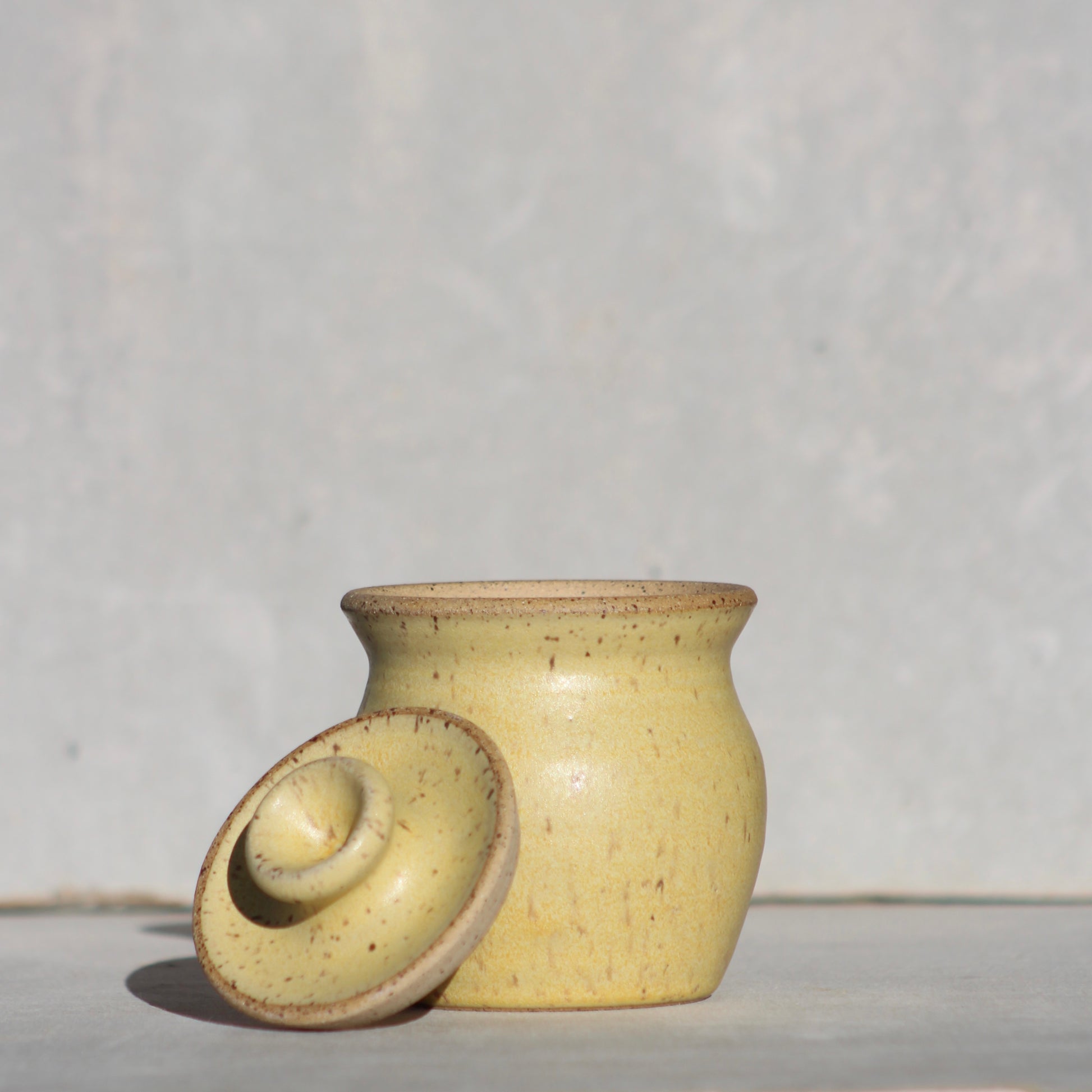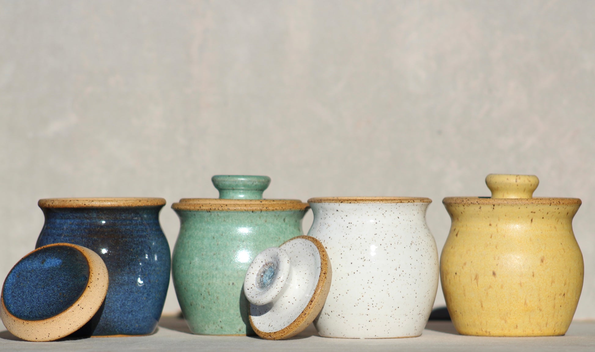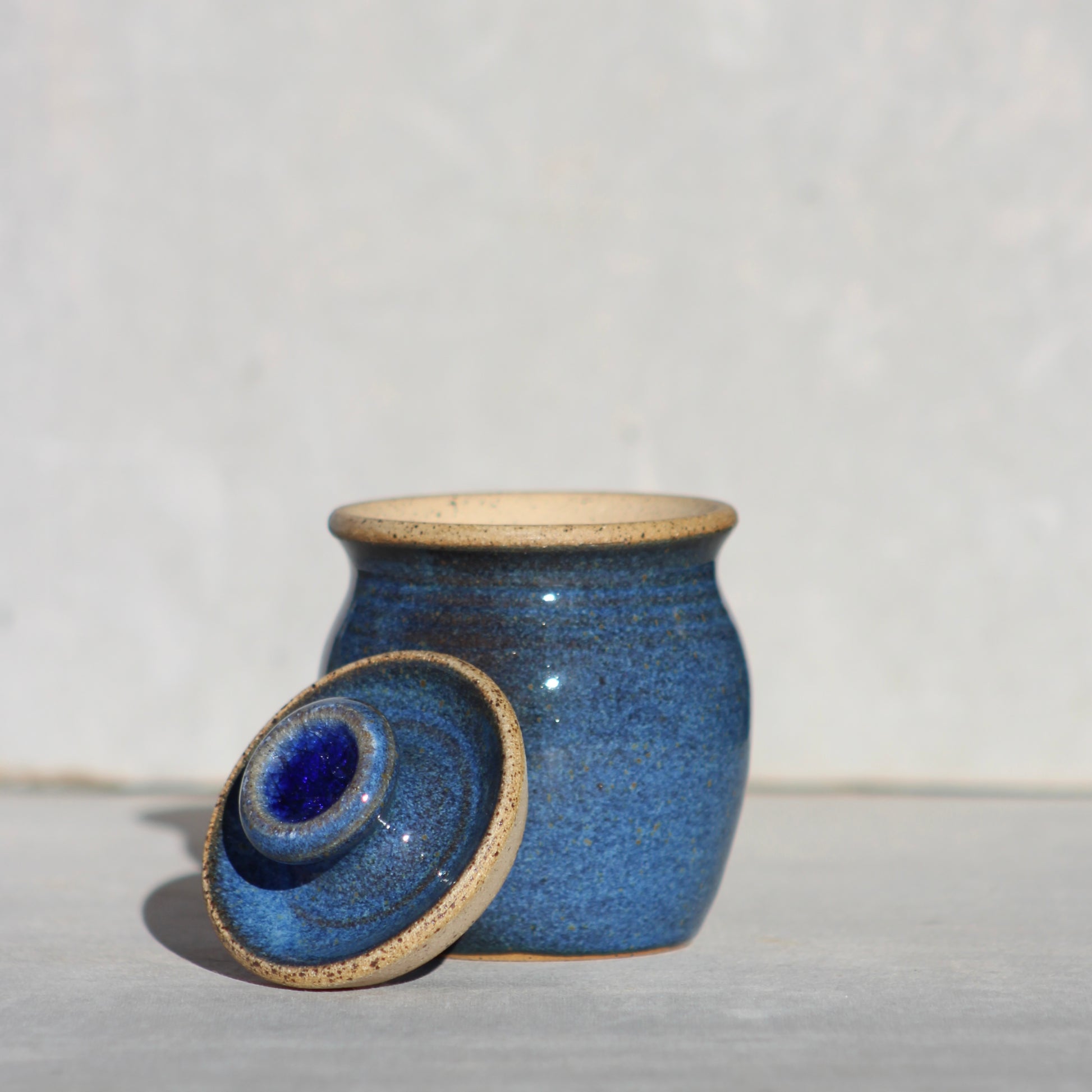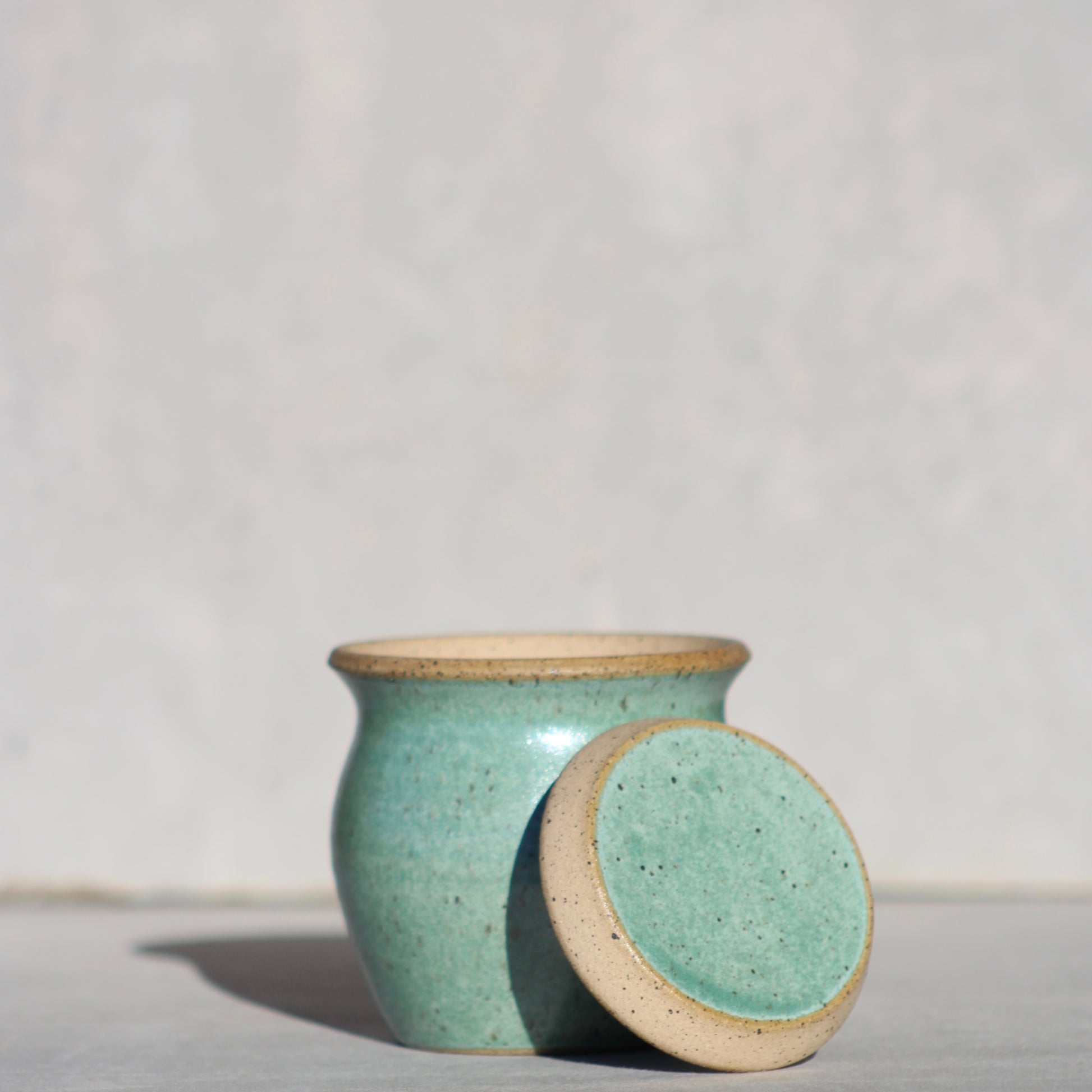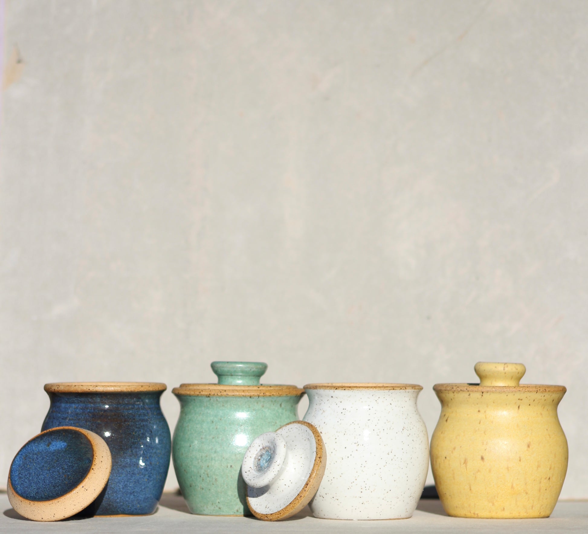 We’ve made a small batch of lidded jars for the season. Choose your color preference at checkout. Each piece has been hand dipped in our handmade, non toxic glaze before firing to stoneware temps.